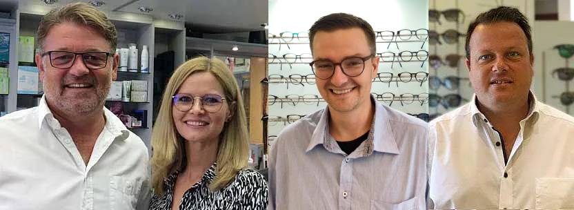 v.l.n.r.: MMst. Klaus Vincourek (Geschäftsführer, Augenoptikermeister, beh. konz. Kontaktlinsenoptiker, Optometrist) Michaela Vincourek (Meister der Optometrie), Simon Tauber (Augenoptikermeister, konz. Kontaktlinsenoptiker), André Schiesser (Augenoptiker)